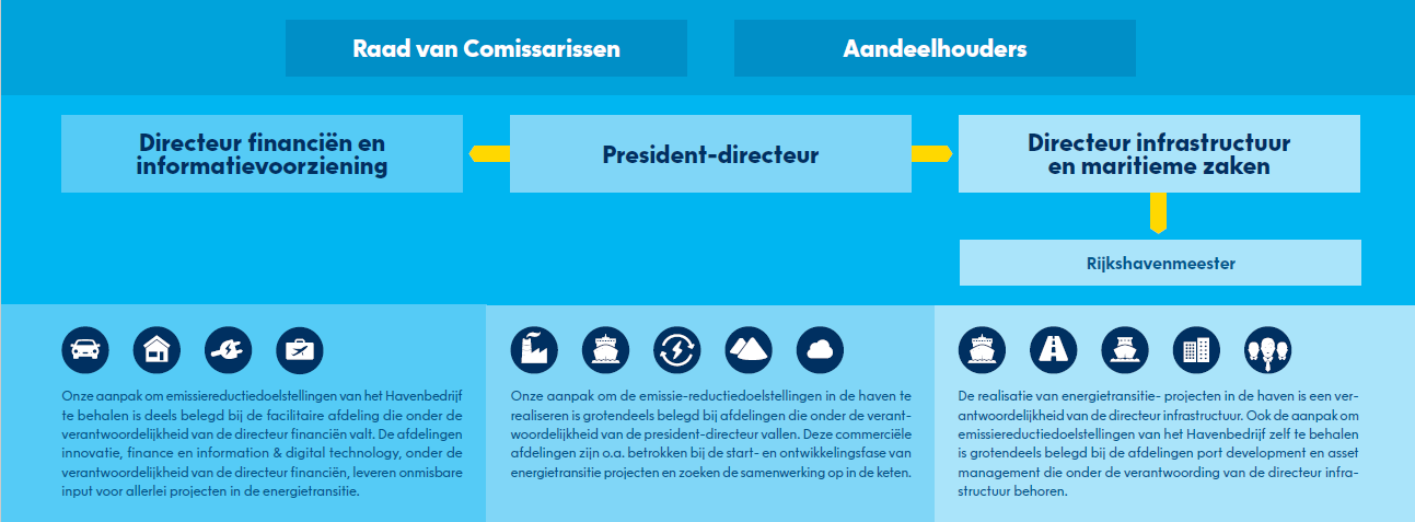 De governance van het Havenbedrijf Rotterdam is gebaseerd op een verlicht structuurregime met een two-tier bestuursstructuur. De Algemene directie heeft de leiding over de onderneming; de onafhankelijke Raad van Commissarissen houdt toezicht op de Algemene directie en de gang van zaken in de onderneming. Onze aandeelhouders oefenen invloed uit op de naamloze vennootschap door middel van de Algemene Vergadering van Aandeelhouders.