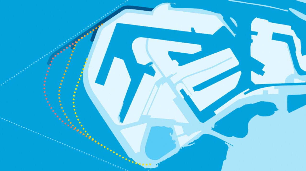 Drie mogelijke vormen van de zeewaartse uitbreiding van de haven, variërend van 380 (gele stippellijn) tot bijna 1.000 ha (rode stippellijn).