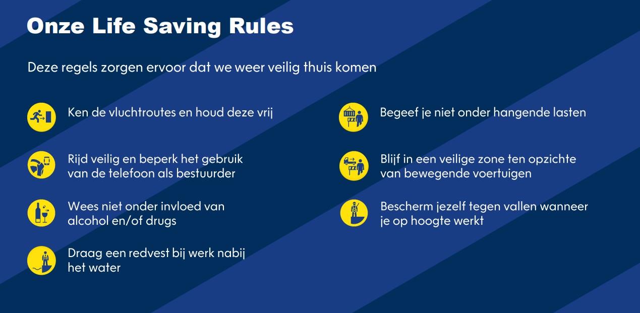 De Arbobeleidsverklaring 'Gezond en Veilig naar Huis' van het Havenbedrijf Rotterdam beschrijft waar we voor staan, wat we doen en waar we dus op aangesproken mogen worden. Deze verklaring geldt voor iedereen die voor ons werkt. De verklaring is afgegeven door onze Algemene directie. Zij zijn verantwoordelijk voor het waarborgen van een veilige werkomgeving. In de actualisatie van dit jaar zijn de kernwaarden respect, focus, verbinding en veerkracht opgenomen. Deze waarden zijn de basis voor iedereen om in een veilige en gezonde omgeving te werken. De belangrijkste risico’s komen samen in onze Life Saving Rules. Het opvolgen van deze regels is zowel voor medewerkers als opdrachtnemers verplicht.