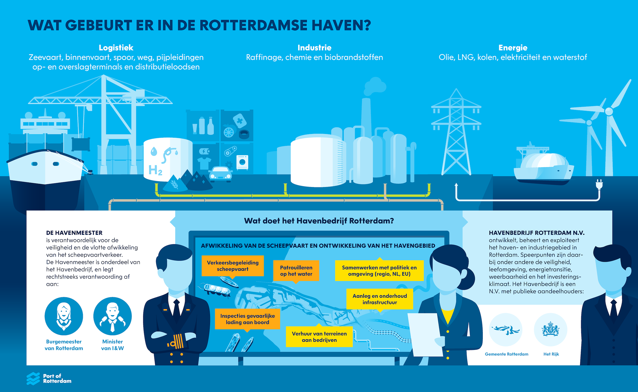 Het Havenbedrijf Rotterdam beheert, exploiteert en ontwikkelt het Rotterdamse haven- en industriecomplex en is verantwoordelijk voor het bevorderen van een effectieve, veilige en efficiënte scheepvaartafwikkeling in de haven en het aanloopgebied voor de kust.
